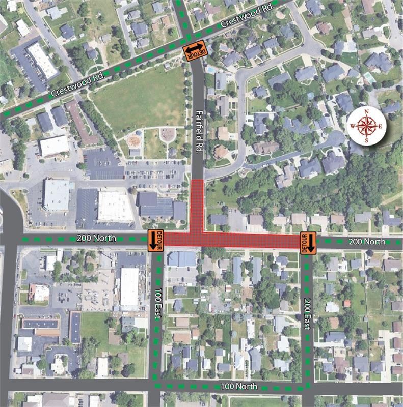 Starting Thursday, May 15 at 7:00 PM to Sunday, May 18 at 7:00 PM, the intersection of Fairfield Road and 200 North will be CLOSED to accommodate installation of new culinary and sewer lines. Traffic will be detoured as follows: