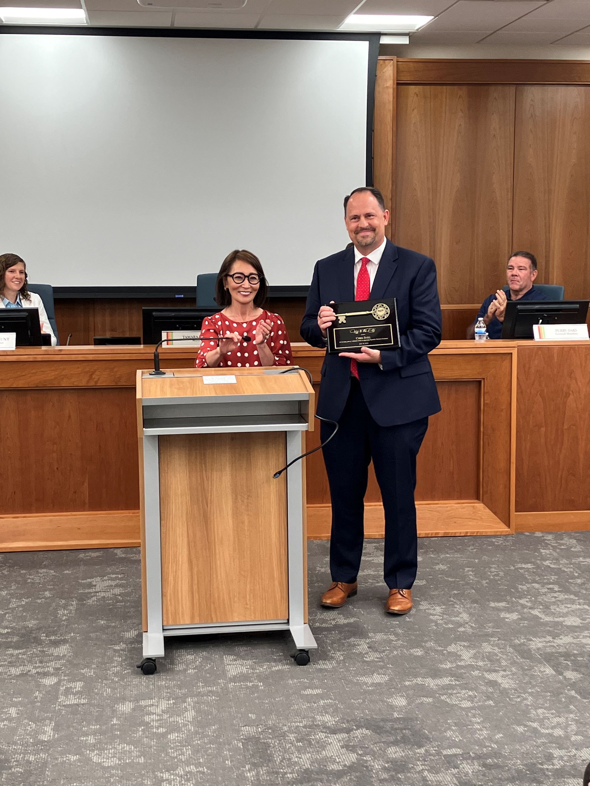 Key to the City Awarded to Chris SnellAt the city council meeting on July 18, 2024, Mayor Tami Tran awarded Chris Snell the Key to the City for his long-standing dedication to the community and his service in organizing Kaysville City's yearly 4th of July Patriotic Devotional for several years. Held at the Davis High School Auditorium, the Patriotic Devotional involves coordinating speakers, bands, and other participants, making it a significant and longstanding tradition in Kaysville. Mayor Tran added that Chris has been involved in various roles within the city over the years, including the Patriotic Devotional. She expressed her appreciation to Chris for his guidance when she decided to run for city council. Former Mayor Steve Hiatt was also present at the meeting, recounting his own experience working with Chris and highlighting Chris's willingness to take on the Patriotic Devotional and return to the city council to fill a vacant term. Mr. Hiatt emphasized Mr. Snell's genuine and sincere dedication to the community, which has brought lasting benefits to Kaysville. The Key to the City Award is a rare honor given to individuals who make substantial contributions to the community.