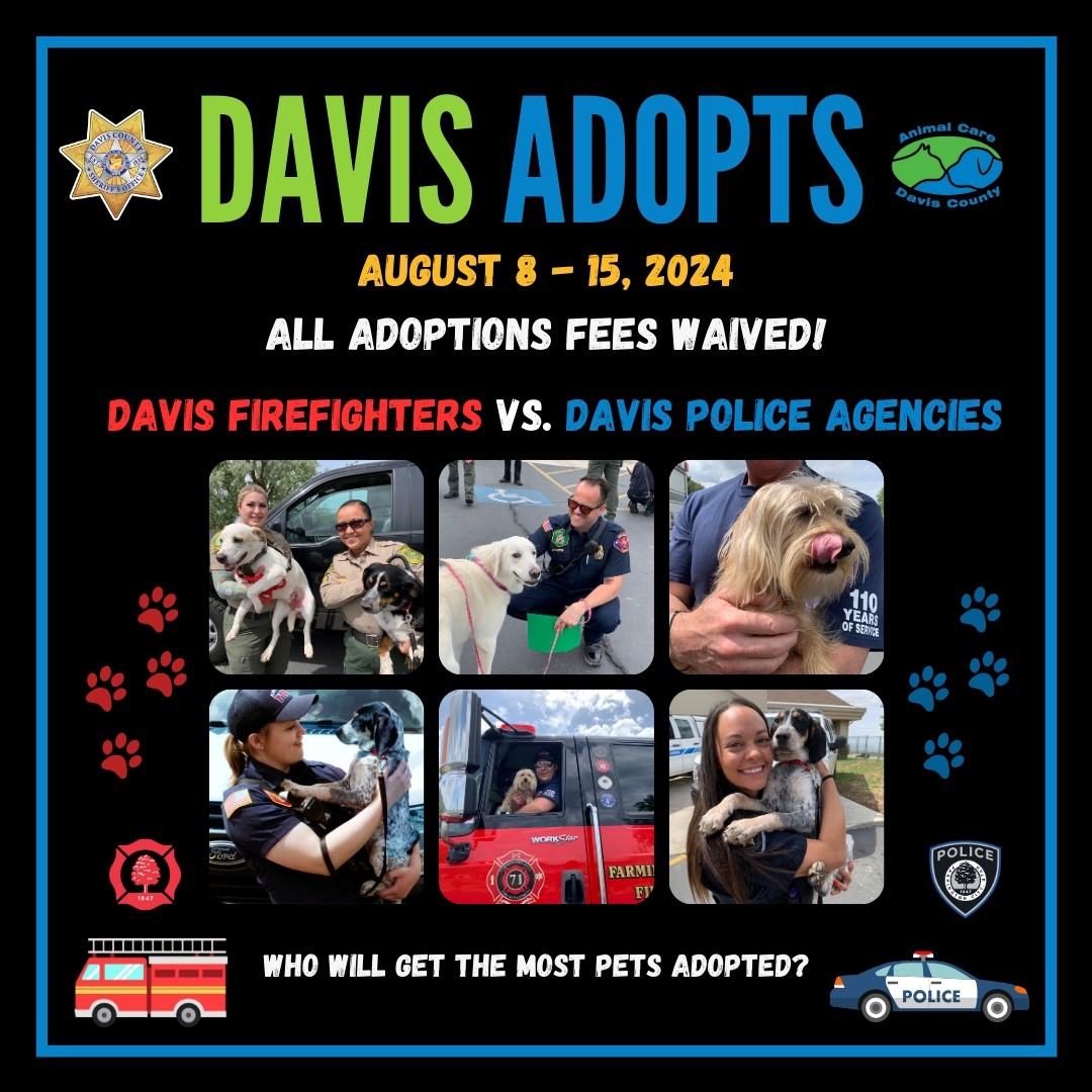 Davis Adopts!Davis Adopts 2024 is taking place from August 8th to 15th! Throughout this event, police and fire agencies across the county will compete to see who can adopt out the most animals. Adoption fees are WAIVED, so be sure to check out Davis Animal Care's pets!