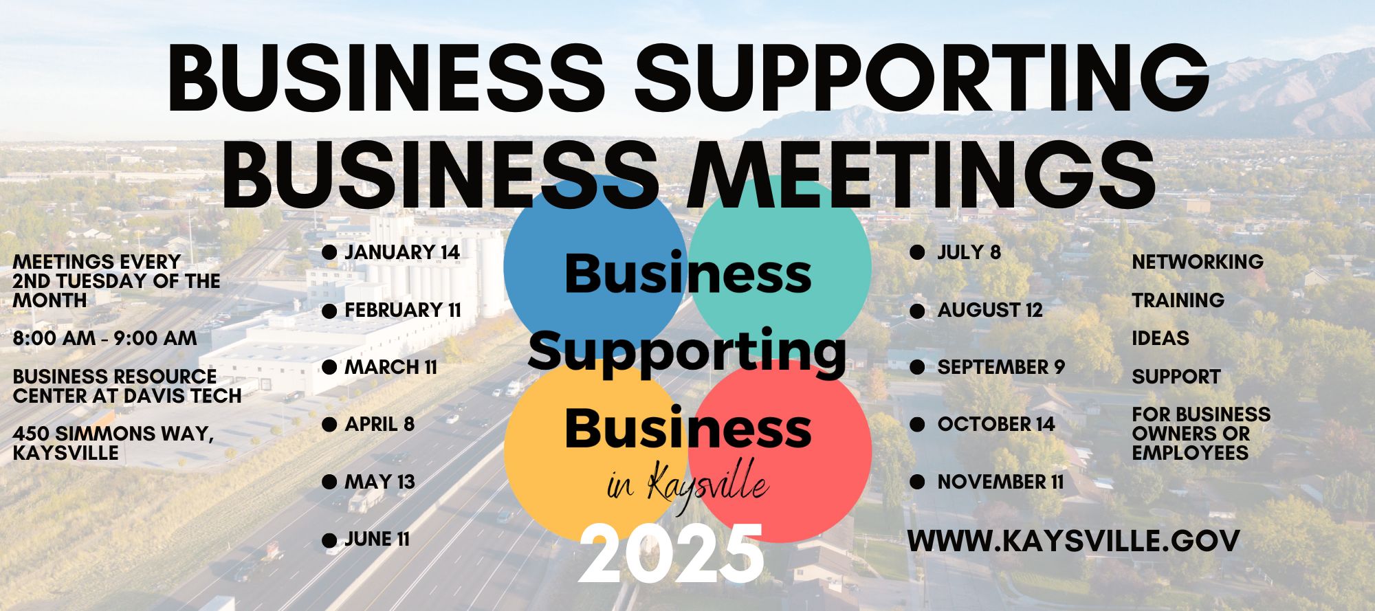 Business Supporting Business in KaysvilleKaysville business owners are invited to attend our Business Supporting Business meetings held the 2nd Tuesday of every month (unless otherwise noted) at the Business Resource Center at Davis Tech located at 450 Simmons Way, Kaysville, Utah. These meetings give an opportunity for local business owners to meet other business owners in our city, and to find out what resources are out there for their business. Meetings begin at 8:00 AM and are an hour long. Our next meeting will be held on Tuesday, January 14, 2025 at 8:00 am. Interested in presenting at an upcoming meeting? Call 801-546-1241 or email businesslicensing@kaysville.gov.