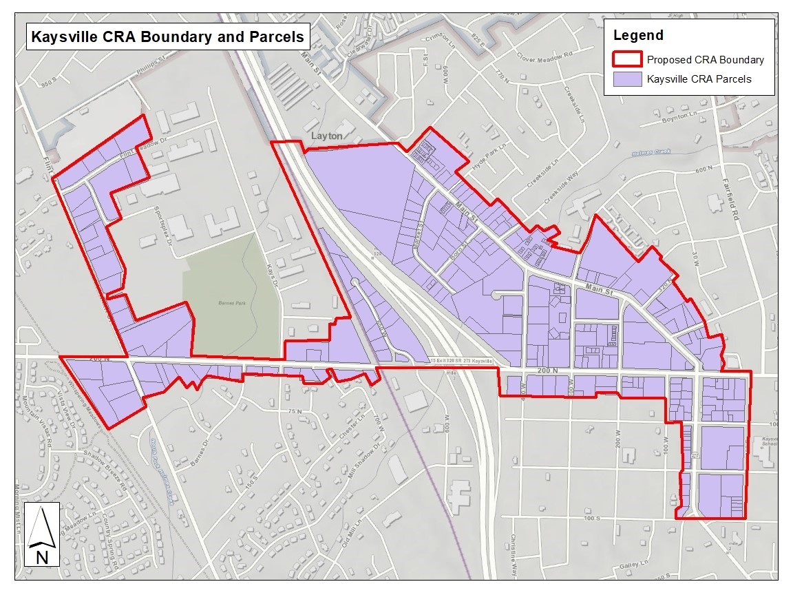 Kaysville City Center Community Reinvestment Area (CRA)The proposed Kaysville City Center Community Reinvestment Area--as show in the photo on the left--was presented at the February 15, 2024 City Council meeting. (Watch the video of the meeting HERE.) The City will be holding a public hearing on January 2, 2025 at 6:30 PM to discuss the project area. In preparation of the public hearing, the City has created a Q&A on the RDA and Community Reinvestment Areas. You can view the Q&A by clicking this link: CRA Q&A. You can also learn more by visiting the city website here: Kaysville Redevelopment Agency.