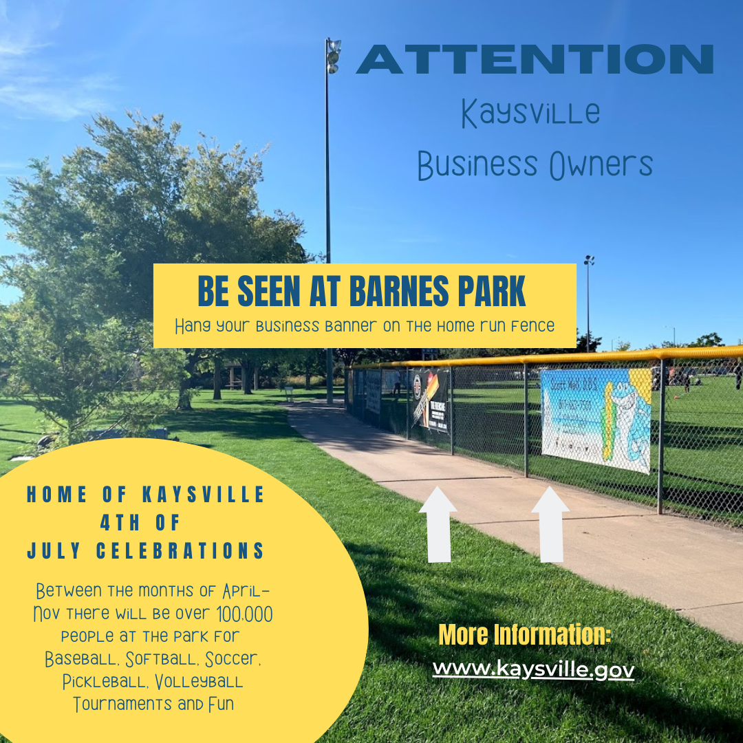 Kaysville Businesses—Hit a Home Run with Your Advertising!It may be cold today in Kaysville, but your business can stay HOT all season long! Promote your brand with a banner at Barnes Park’s home run fence and reach thousands of local families, athletes, and fans. Don’t wait—secure your spot before the season starts! DM us or contact Meghann Badger at mbadger@kaysville.gov to get started. Let’s warm up the field with your business!