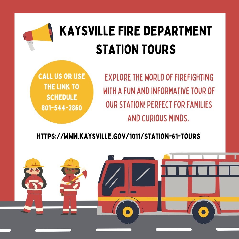 Tour the Fire Station & Meet Your Local Firefighters! Residents, schools, and community groups of Kaysville City are welcome to tour the fire station and meet the firefighters who serve our community. Come learn how the Fire Department serves the city, helpful fire safety information, and, of course, check out the fire trucks. Fire Station Tours