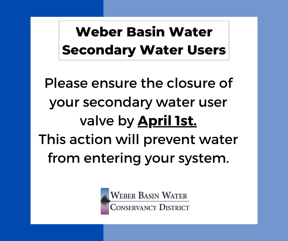 Secondary Water Season is Almost HereAs we prepare for the upcoming irrigation season, here are a few important reminders for residents using secondary water: 1. Close Your User Valve by April 1: To prevent water from entering your system prematurely, please make sure your secondary water valve is shut off by April 1. 2. Water System Available by April 15: It is anticipated that all secondary water systems will be fully pressurized and ready for use by April 15. Keep in mind that this may vary slightly by area. 3. Use Water Wisely: Even though water will be available by mid-April, we encourage you to hold off on watering until your landscape actually needs it. 4. Planning Sod or Seeding? Be sure to confirm water availability before scheduling any landscaping projects that depend on irrigation. Kaysville receives secondary water from the Weber Basin Water Conservancy District, which supplies wholesale water to local providers. Within Kaysville, there are three independent agencies that manage secondary water delivery: Benchland Water District Davis and Weber Counties Canal Company Haights Creek Irrigation Company Each operates separately from the city and sets its own rates, schedules, and water use restrictions. For specific information about your provider—including watering schedules, restrictions, and enforcement—please visit their respective websites. Let’s all do our part to conserve water and use this valuable resource responsibly! You can find the stream flows here: https://weberbasin.gov/NaturalSystems/StreamAndReservoir Weber Basin Water reservoir levels can be found here: https://www.usbr.gov/uc/water/basin/index.html#tab-2 Important Safety Alert!SECONDARY WATER IS DIFFERENT FROM DRINKING WATER AND SHOULD ONLY BE USED TO WATER YARDS. DRINKING OR PLAYING IN SECONDARY WATER CAN MAKE YOU SICK! In light of recent health concerns related to secondary water usage, the Utah Department of Health and Human Services is issuing an urgent safety alert and launching SecondaryWater.utah.gov to raise awareness about the potential health risks associated with secondary water. If you have questions about secondary water safety, please call the Utah Department of Health and Human Services at 801-538-6191 or email epi@utah.gov.