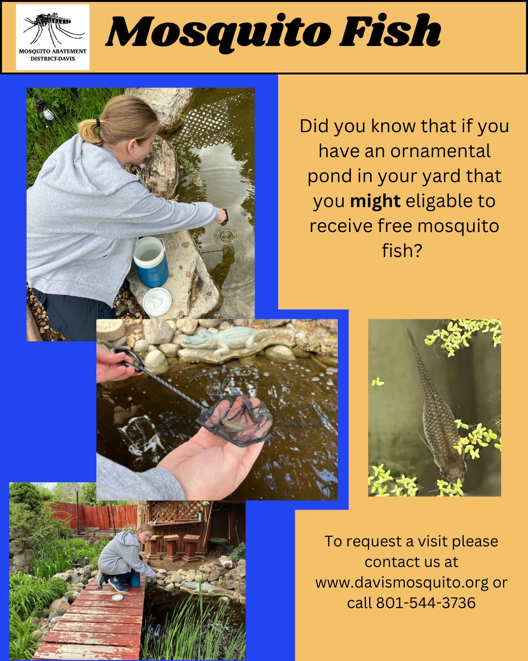 Protect Your Pond—And Your Summer—from MosquitoesGot an Ornamental Pond? You May Qualify for Free Mosquito Fish! If you have an ornamental pond and regularly notice mosquito larvae, you may be eligible to receive free mosquito fish through a Davis County program. These fish are a natural and effective way to control mosquito larvae in standing water.