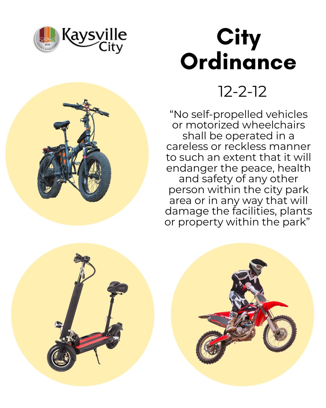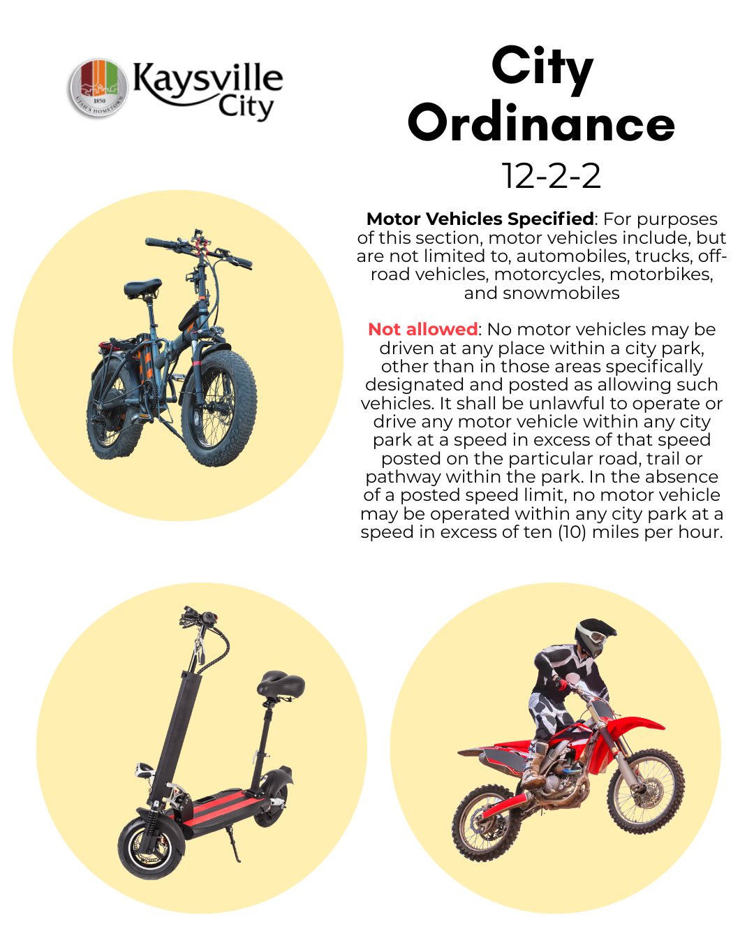 Ride Smart, Ride Safe: Know the Rules for Motorized and Self-Propelled Vehicles in Public SpacesWith summer in full swing, there’s been a noticeable increase in the use of electric bikes, scooters, and motorcycles throughout Kaysville—especially on sidewalks, roads, and in city parks. While these vehicles can be convenient and fun, it’s important to understand that they are subject to specific city ordinances to help ensure public safety. Kaysville City has adopted ordinances that regulate the use of motorized vehicles, off-highway vehicles (OHVs), and self-propelled vehicles on public property, including in parks. These rules are in place to protect pedestrians, prevent property damage, and promote responsible riding practices across our community. We encourage all residents—especially parents—to take a moment to review these rules with their children. Knowing what is and isn’t allowed can prevent accidents, injuries, and citations. Key Points to Remember: - Riding in a reckless or careless manner is prohibited and may result in warnings, fines, or even impoundment of the vehicle. - Motorized vehicles are not allowed in parks except where specifically posted. - Speed limits apply—10 mph maximum if no signage is posted. - Helmet laws apply to certain age groups and vehicle types. - Different classifications of e-bikes, scooters, and motorcycles come with different rules—see the included graphics for a full breakdown. By following these regulations, we can help maintain a safe and enjoyable environment in our parks, trails, and public spaces. 👉 For a complete list of ordinances, visit: Kaysville Municipal Code – Parks and Public Property