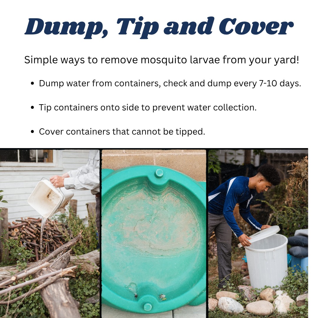 Mosquito Prevention Starts in Your BackyardWe all help with mosquito control in our yards when we dump, tip and cover containers which collect water. As we reduce the locations where water collects, we reduce the mosquito population around our yard. Weekly inspections of the yard to ensure that all containers have been dumped, tipped or covered. If you have any questions about mosquito control in Davis County, please contact us. Visit www.davismosquito.org or call us at 801-544-3736.