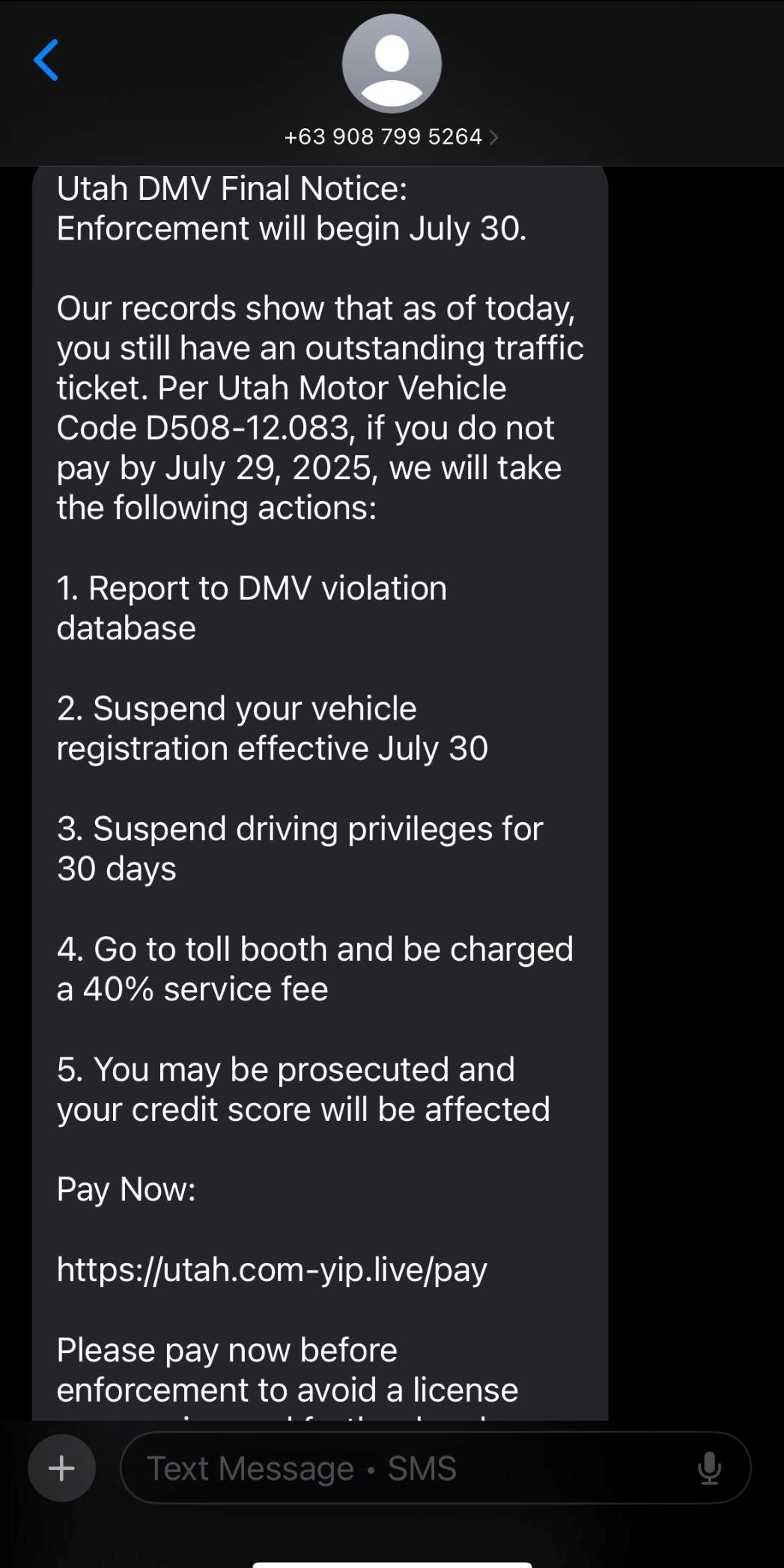Fake Traffic Ticket Text Scam Alert Our community has recently seen an increase in scam text messages claiming you have an outstanding traffic ticket. These messages often include a link urging you to click and pay the "ticket" online. Please do not click the link or provide any payment information. This is a scam designed to steal your personal and financial details. If you receive a message like this: - Do not click on any links. - Block the sender. - Delete the message. If you’re unsure about a message or have any questions, please feel free to give us a call. We're here to help. Stay safe and alert!