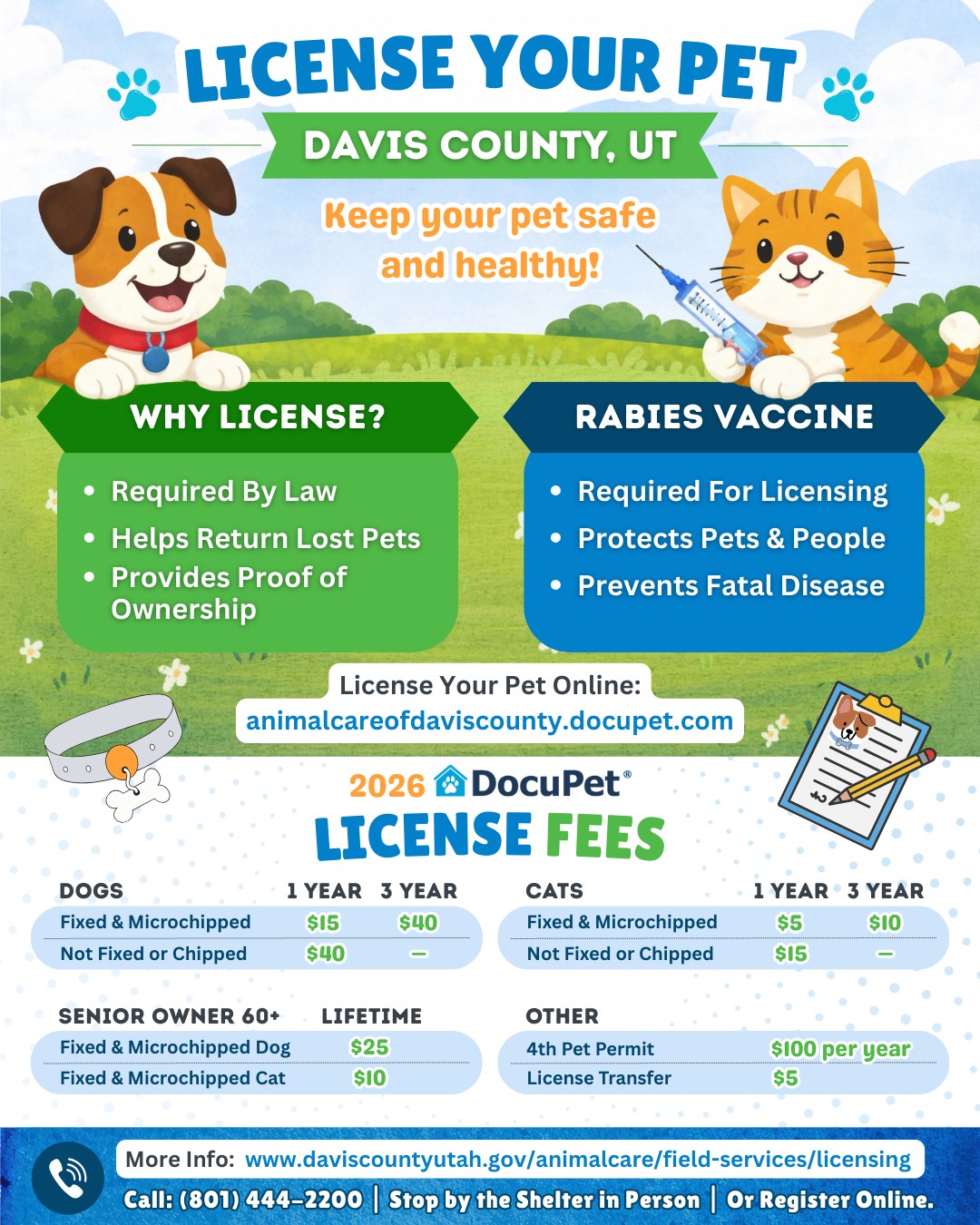 License Your Pet OnlineDavis County Animal Care reminds residents that all dogs and cats over four months old must be vaccinated for rabies and licensed, as required by Davis County ordinance. Pet licensing helps protect public health, increases the likelihood of reuniting lost pets with their families, and supports essential animal services throughout the community. To make the process easy, Davis County Animal Care has partnered with DocuPet® to offer convenient pet licensing online or in person at the shelter. Licensed pets receive an official tag that includes HomeSafe® 24/7 Lost Pet Service, designed to help pets return home more quickly if they become lost. Proof of current rabies vaccination is required to obtain a license. Residents are also reminded that Davis County limits households to three pets, with an additional permit required for a fourth. Pet licenses can be obtained online at: http://animalcareofdaviscounty.docupet.com/ Davis County Animal Care 📍 1422 E 600 N, Fruit Heights, UT 84037 🕘 Monday–Friday: 10:00 a.m.–6:00 p.m. 🕘 Saturday: 10:00 a.m.–5:00 p.m. 🕘 Sunday: Closed